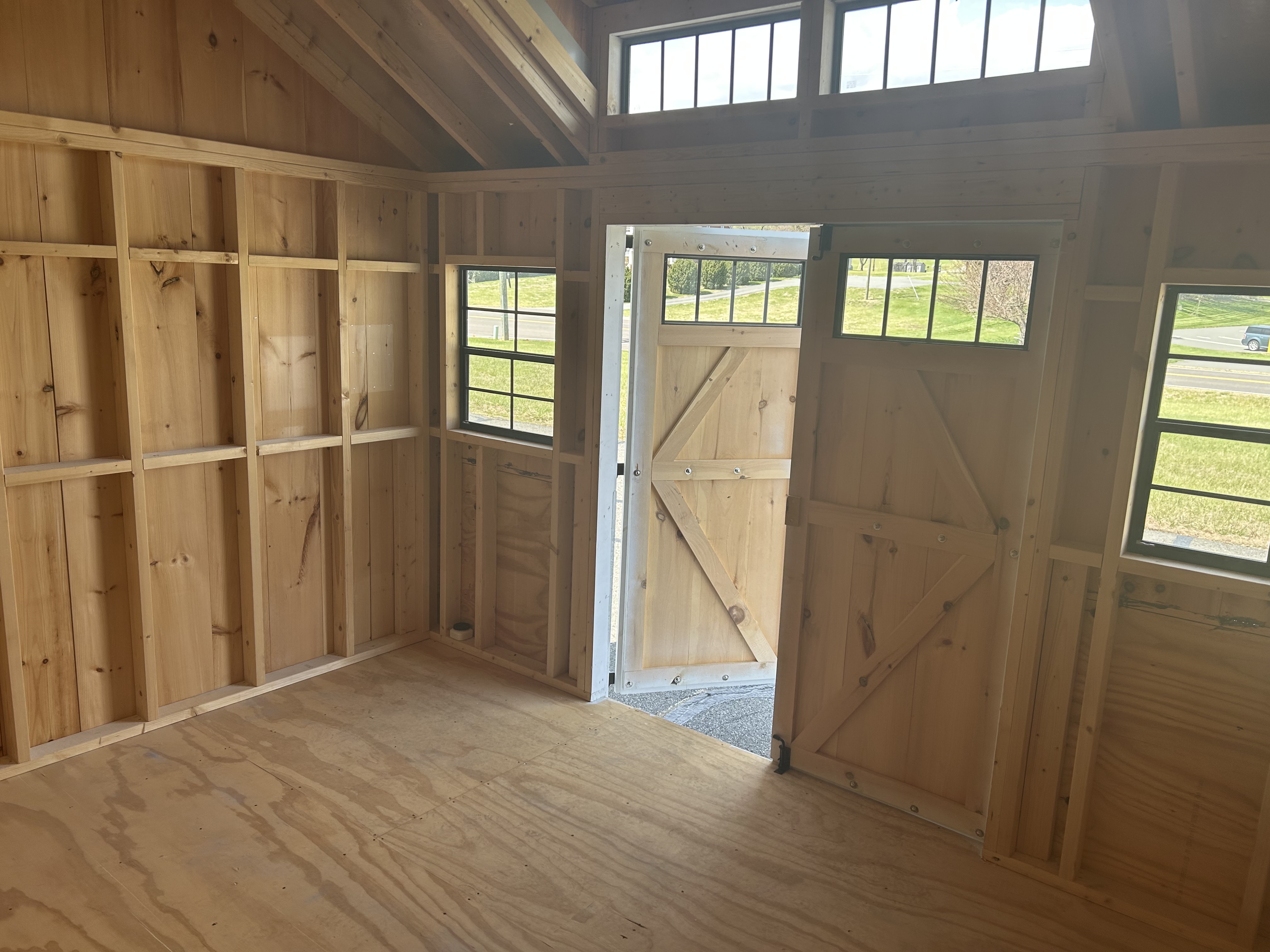 A wooden double door allows easy access for tools, equipment, or seasonal storage, and two additional windows brighten the interior, creating a welcoming, functional space.