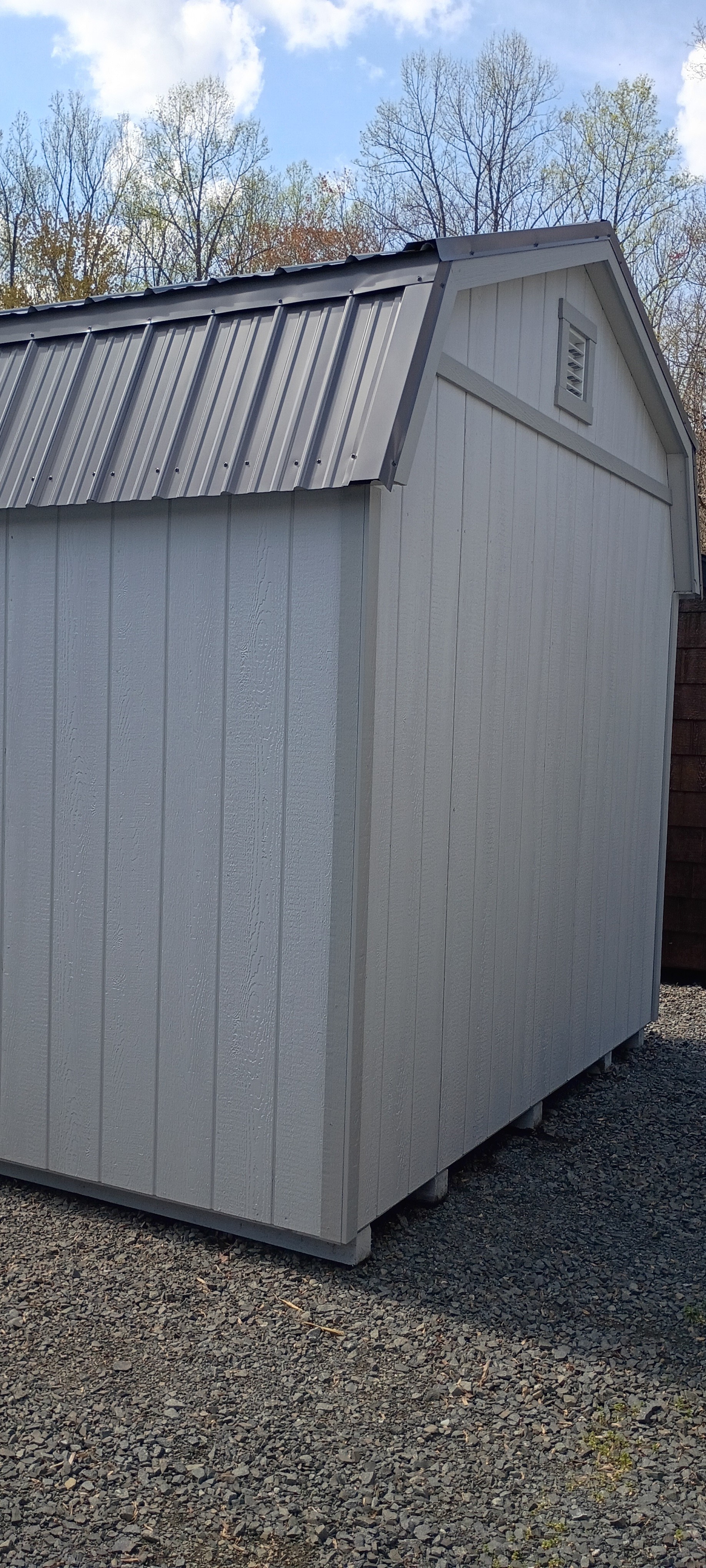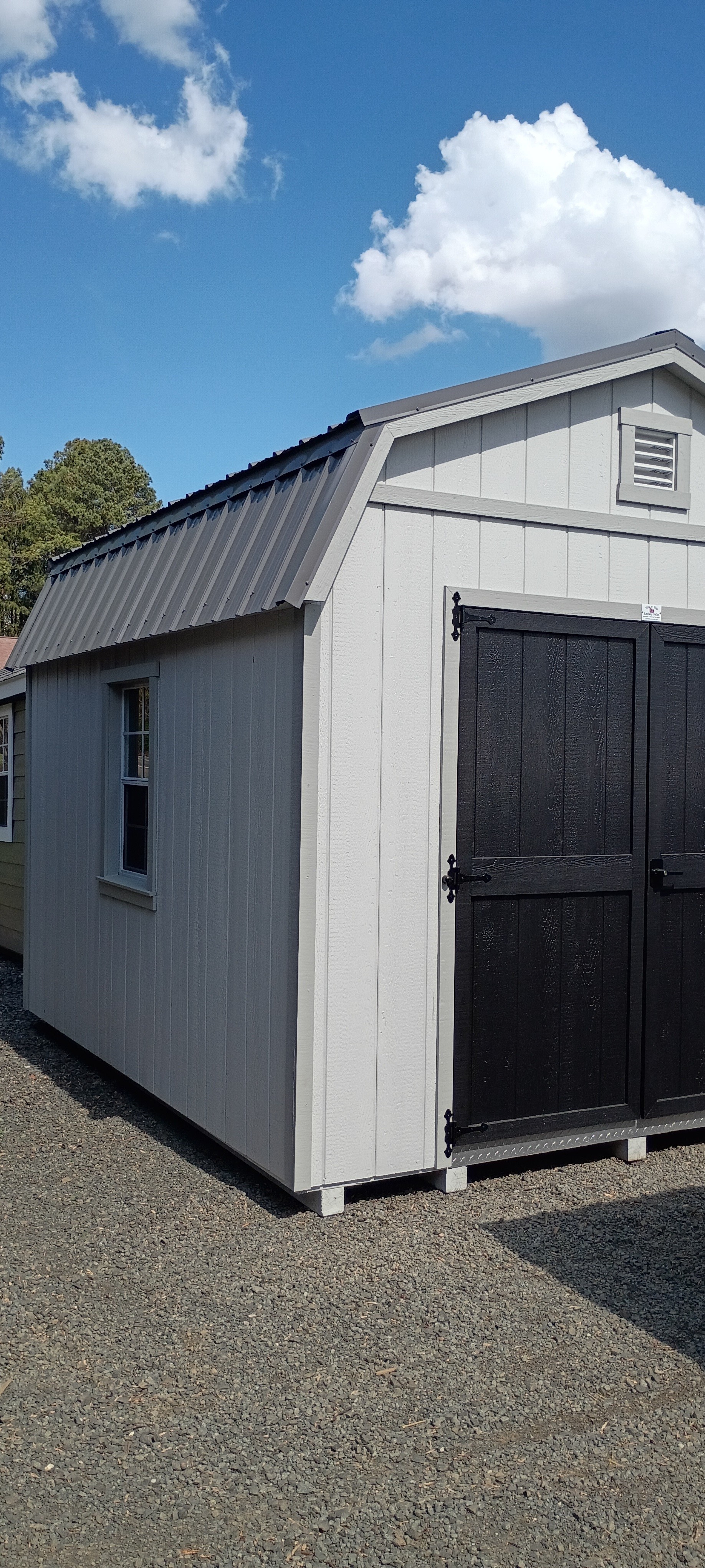 Built for durability and everyday performance, this custom structure features rugged T1-11 siding finished in a versatile GP Gray, complemented by Zook Gray trim for a subtle, two-tone contrast that enhances its modern appeal. The charcoal rolled metal roof adds long-lasting protection while giving the building a strong, finished look.