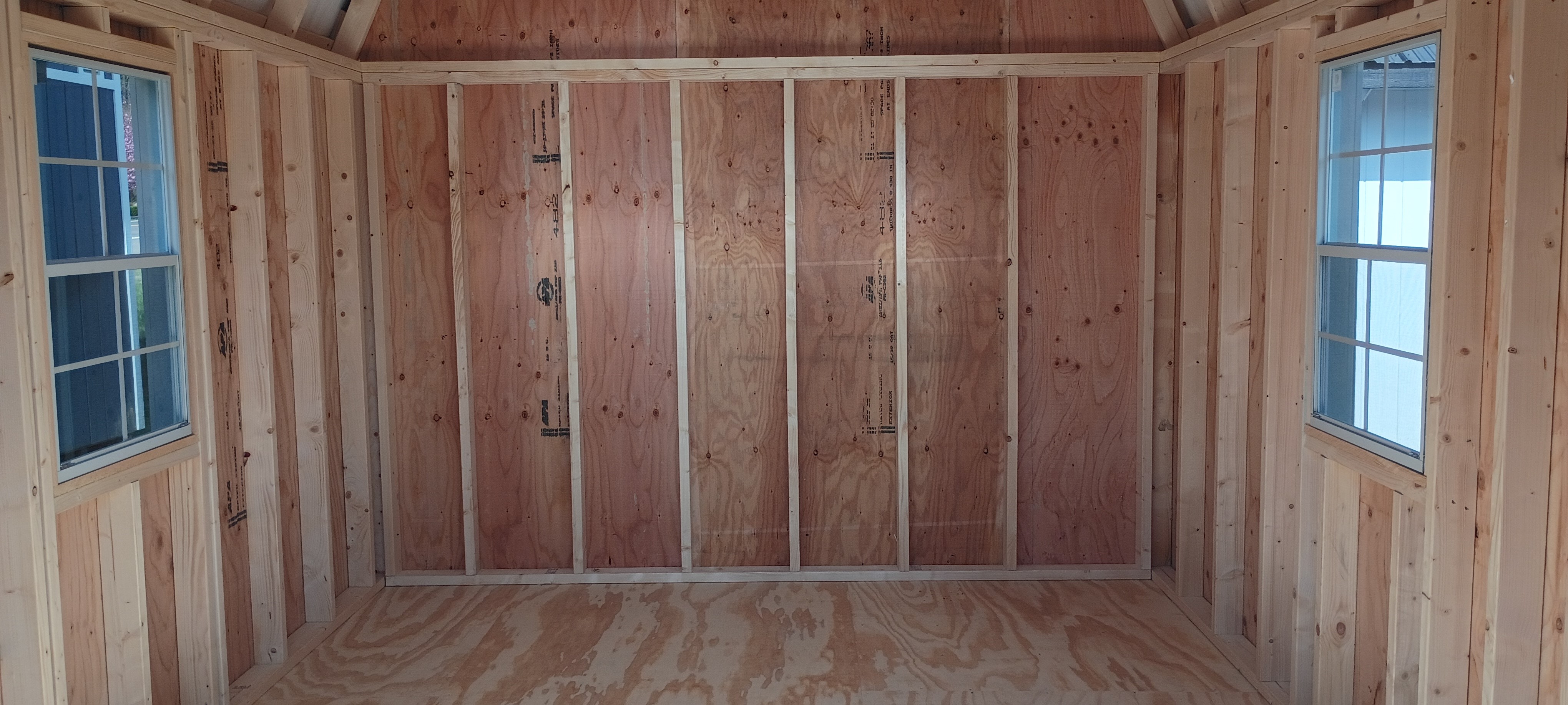 A set of solid wooden double doors provides easy access for equipment, tools, or larger items, making this structure as practical as it is dependable. Two windows allow in natural light while maintaining privacy and security.