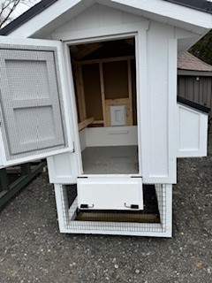 Extended Overhangs, Wire Door into Run, Transom Window above Nesting BoxesThis 4×8 A-Frame Combo Coop features durable T1-11 SmartPanel siding in a clean White-on-White finish with a Black rolled-metal roof. It includes a clean-out door, chicken door with ramp, nesting boxes, roosting bars, and glassboard flooring for easy maintenance. The attached run and extended overhang provide added protection and outdoor space, while a non-insulated window and transom window offer natural light and ventilation throughout the coop.