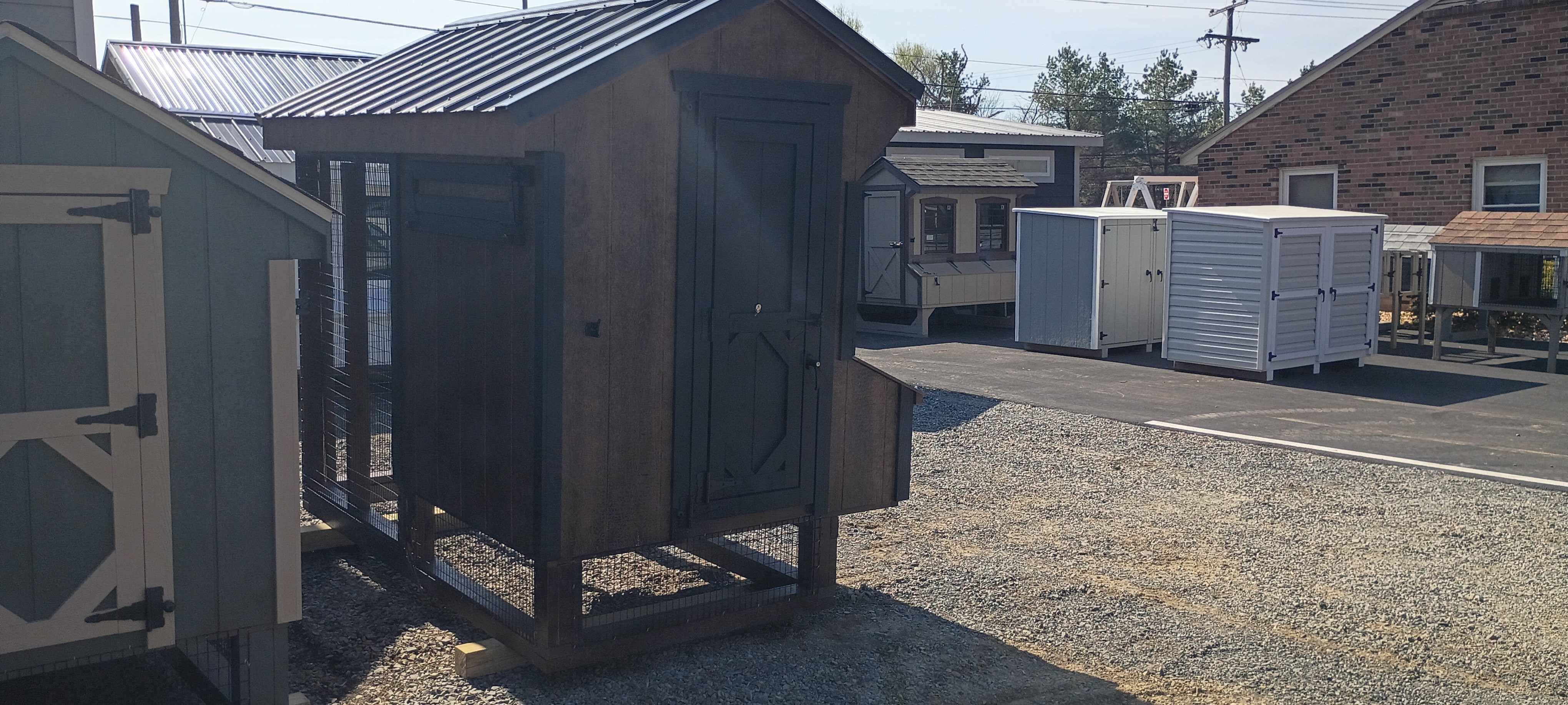 Blending rustic warmth with modern durability, this custom combo coop is thoughtfully designed for both functionality and visual appeal. It features sturdy T1-11 siding finished in a rich chestnut tone, accented by bold black trim for a striking, high-contrast look. The black rolled metal roof provides reliable, long-lasting protection while completing the structure’s clean, finished design.