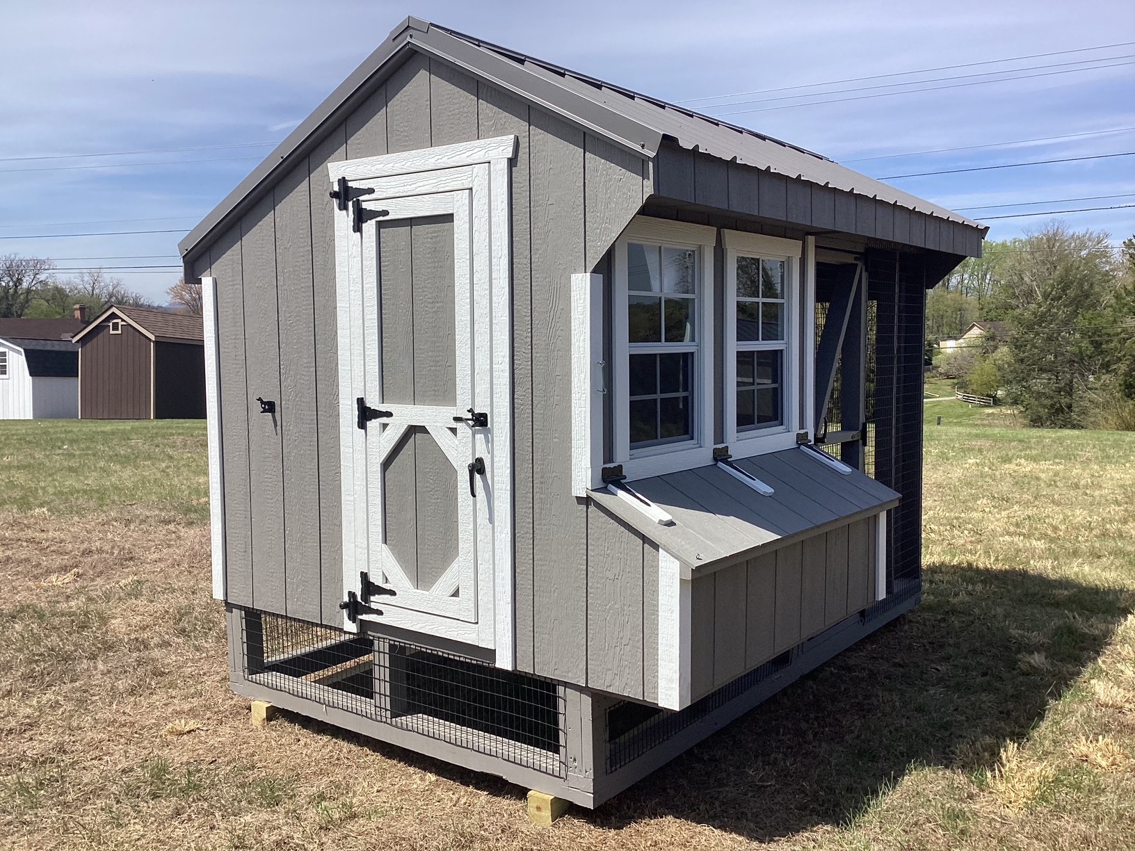 The 6x10 Quaker Coop is a practical and stylish home for your chickens, designed for both comfort and convenience. Its classic Quaker-style overhang and Board & Batten siding in Pewter with crisp white trim create a clean, timeless look that complements any backyard.