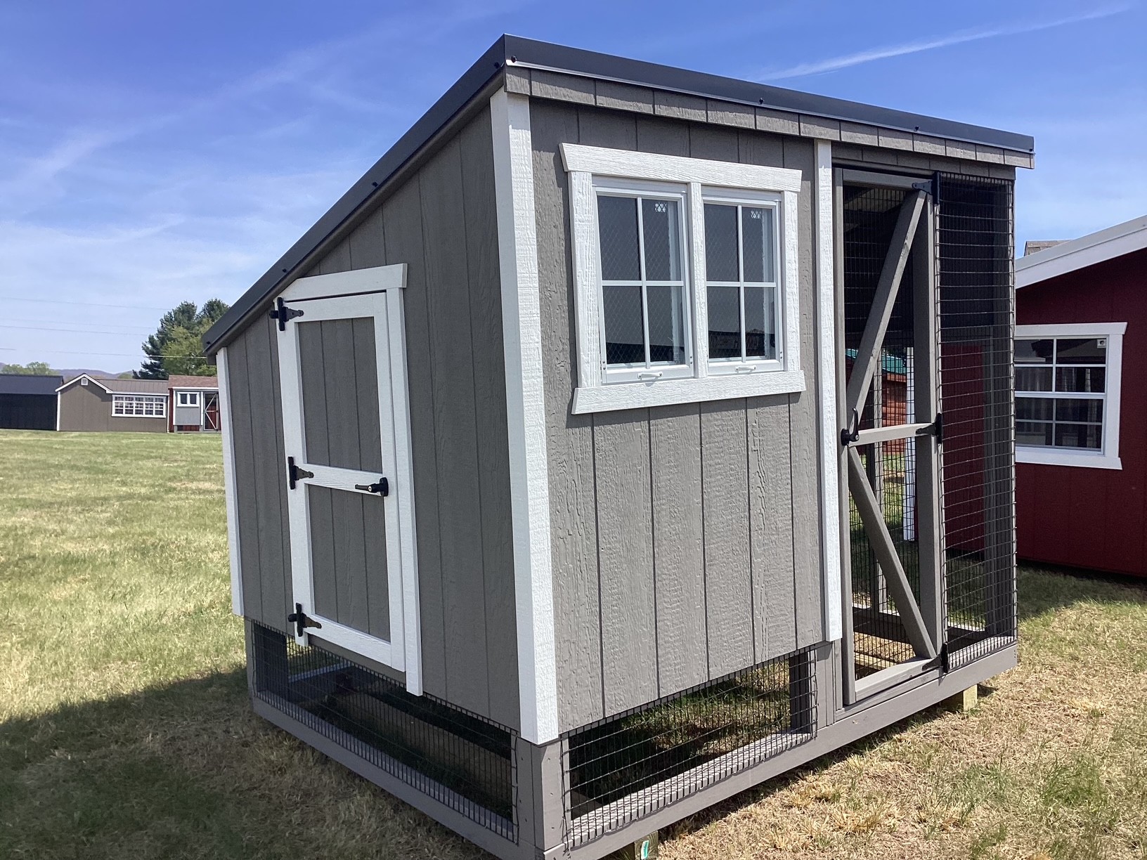 The 6x8 Lean-To Combo Coop is a practical and durable home for your backyard flock. Constructed with Pewter LP Smart Panel siding and crisp white trim, it offers a clean, modern look that complements any outdoor space.
