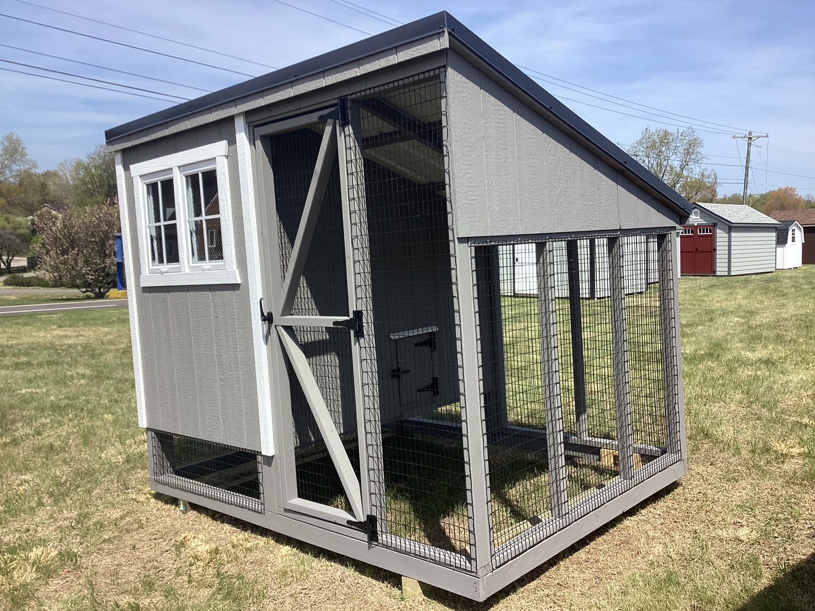 A pewter rolled metal roof provides reliable weather protection, while the attached run gives your chickens safe space to move and stretch. The interior features an epoxy-coated floor for easy cleaning and long-lasting durability, along with built-in nesting boxes and roosting bars to support your flock’s comfort and productivity.