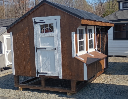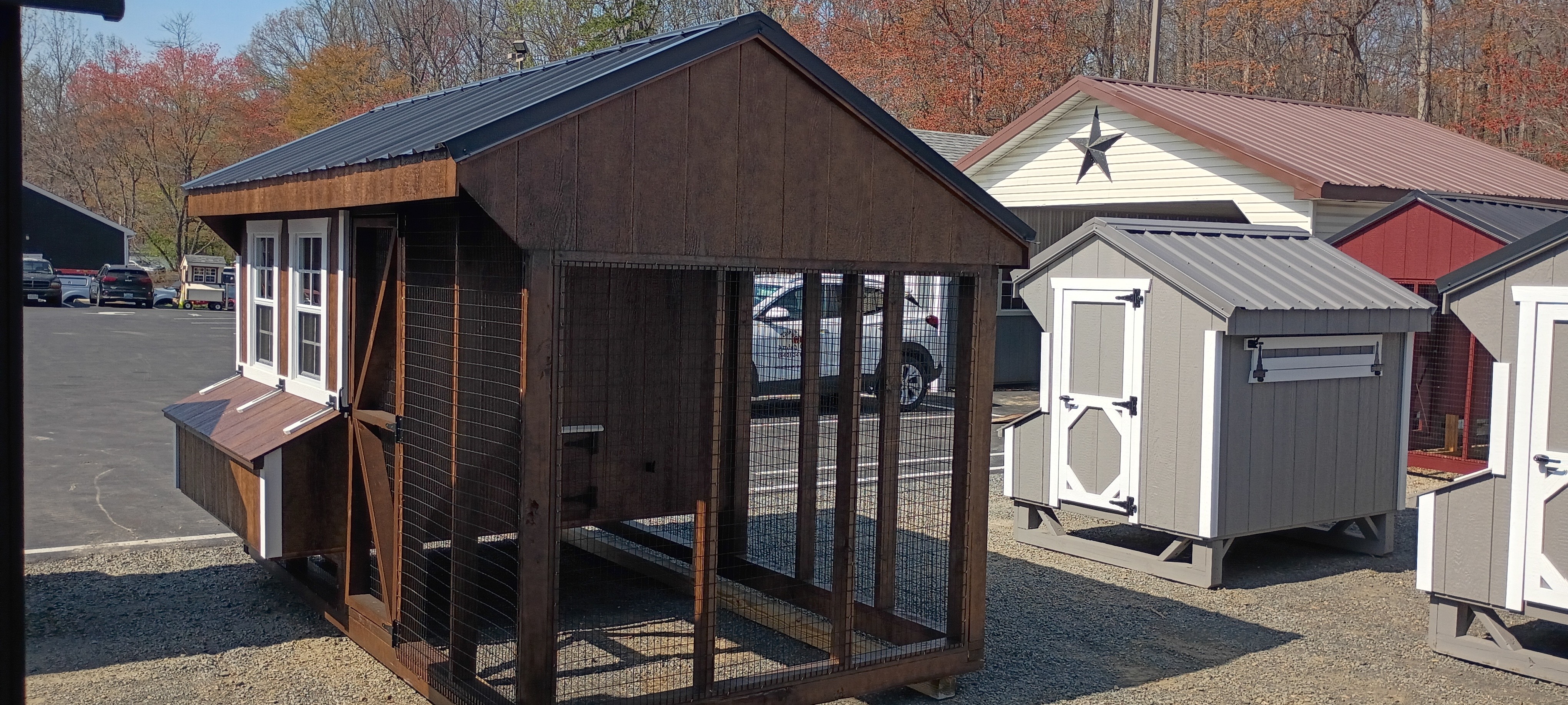 Combining classic charm with modern functionality, this custom combo coop features durable T1-11 siding in rich chestnut, accented by crisp white trim for a bright, timeless contrast. The black rolled metal roof provides long-lasting protection while creating a striking exterior.