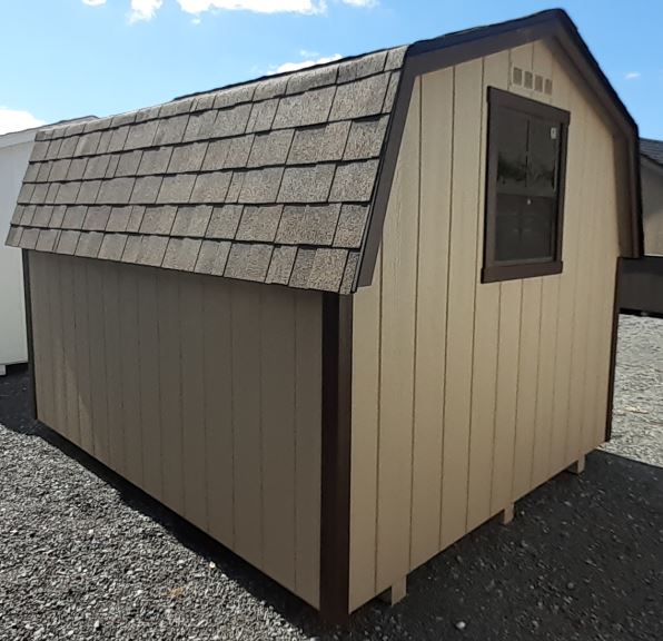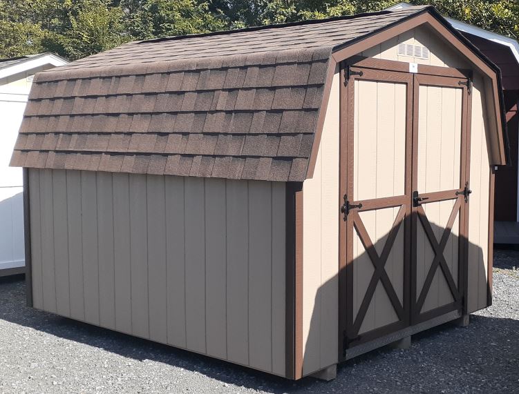 This 8x10 Mini Barn offers compact, dependable storage with classic barn styling. It features T1-11 Duratemp siding with MiraTEC trim, paired with durable shingle roofing in Dual Brown. A 5' wooden double door provides easy access for lawn equipment and larger items, while a 24"x37" non-insulated window adds natural light. Built on 4x4 pressure-treated skids with 5/8" BC sanded plywood flooring and a ridge vent for airflow, this unit delivers solid construction and everyday functionality in a small footprint.