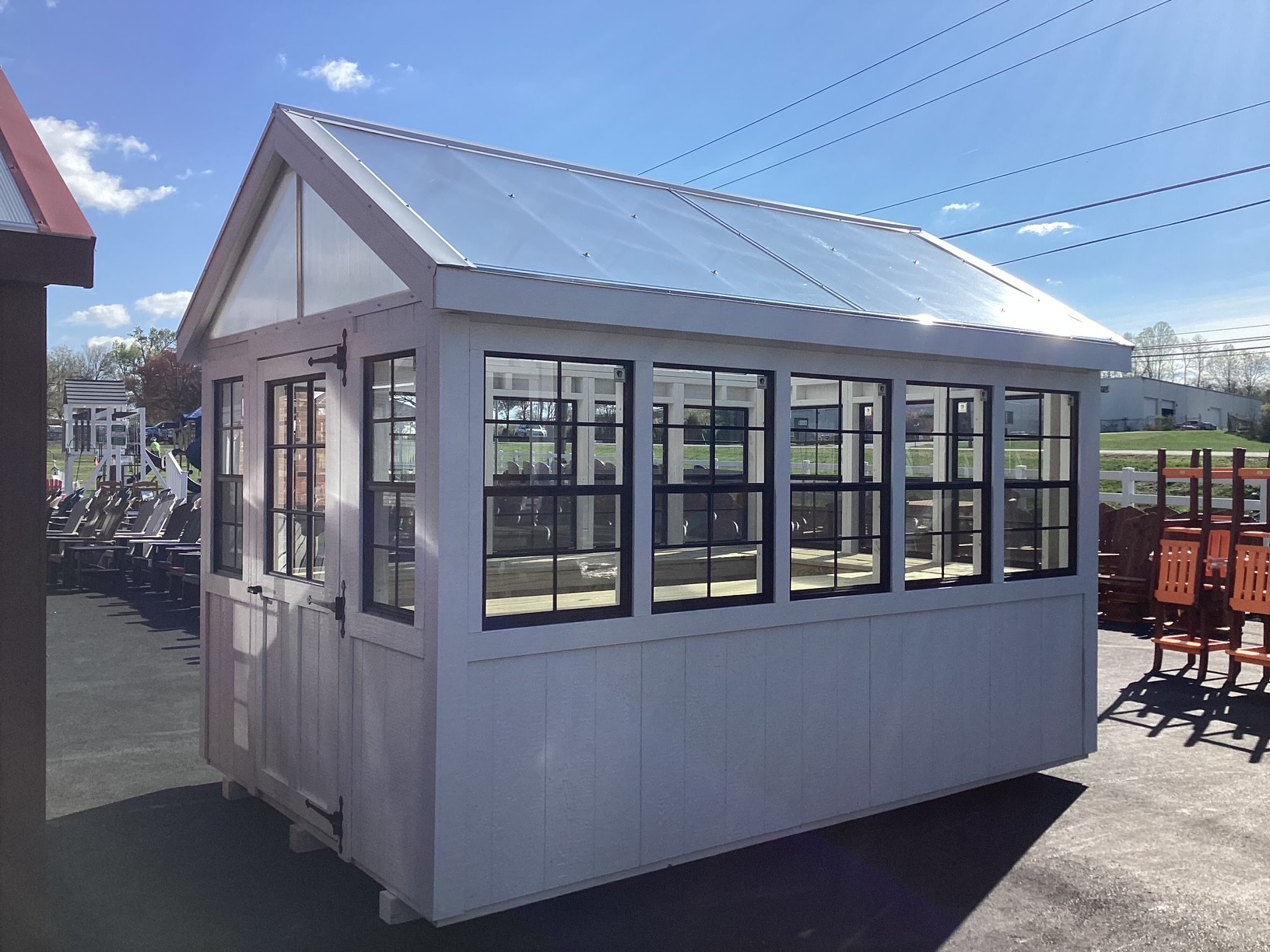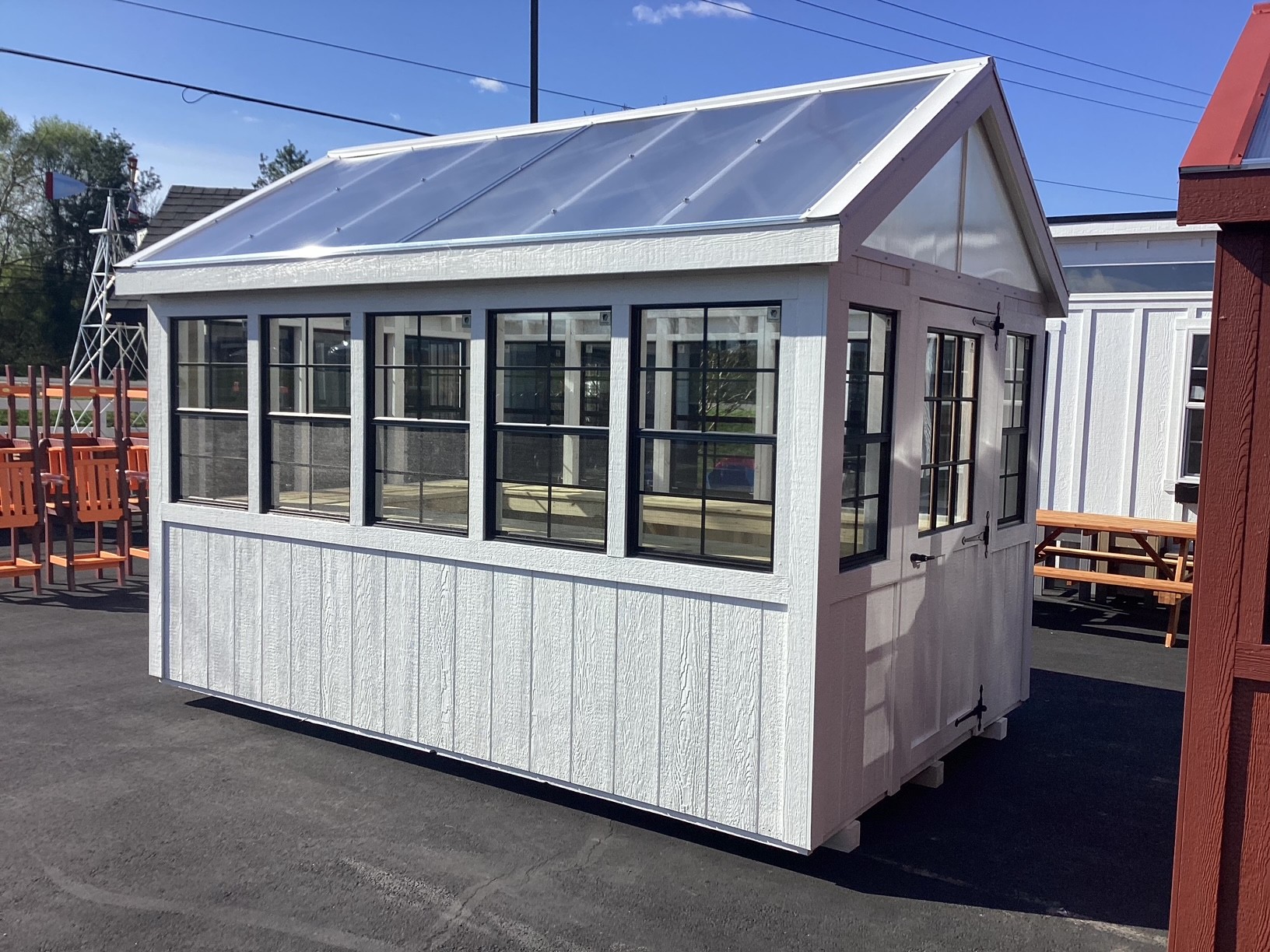 Designed with a bright, modern aesthetic and built for everyday functionality, this custom structure features durable T1-11 siding finished in crisp white, complemented by matching trim for a sleek, seamless look. The clear polycarbonate roof allows natural sunlight to pour in, creating an open, well-lit interior throughout the day.