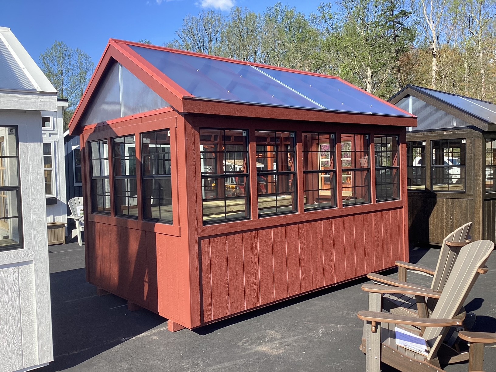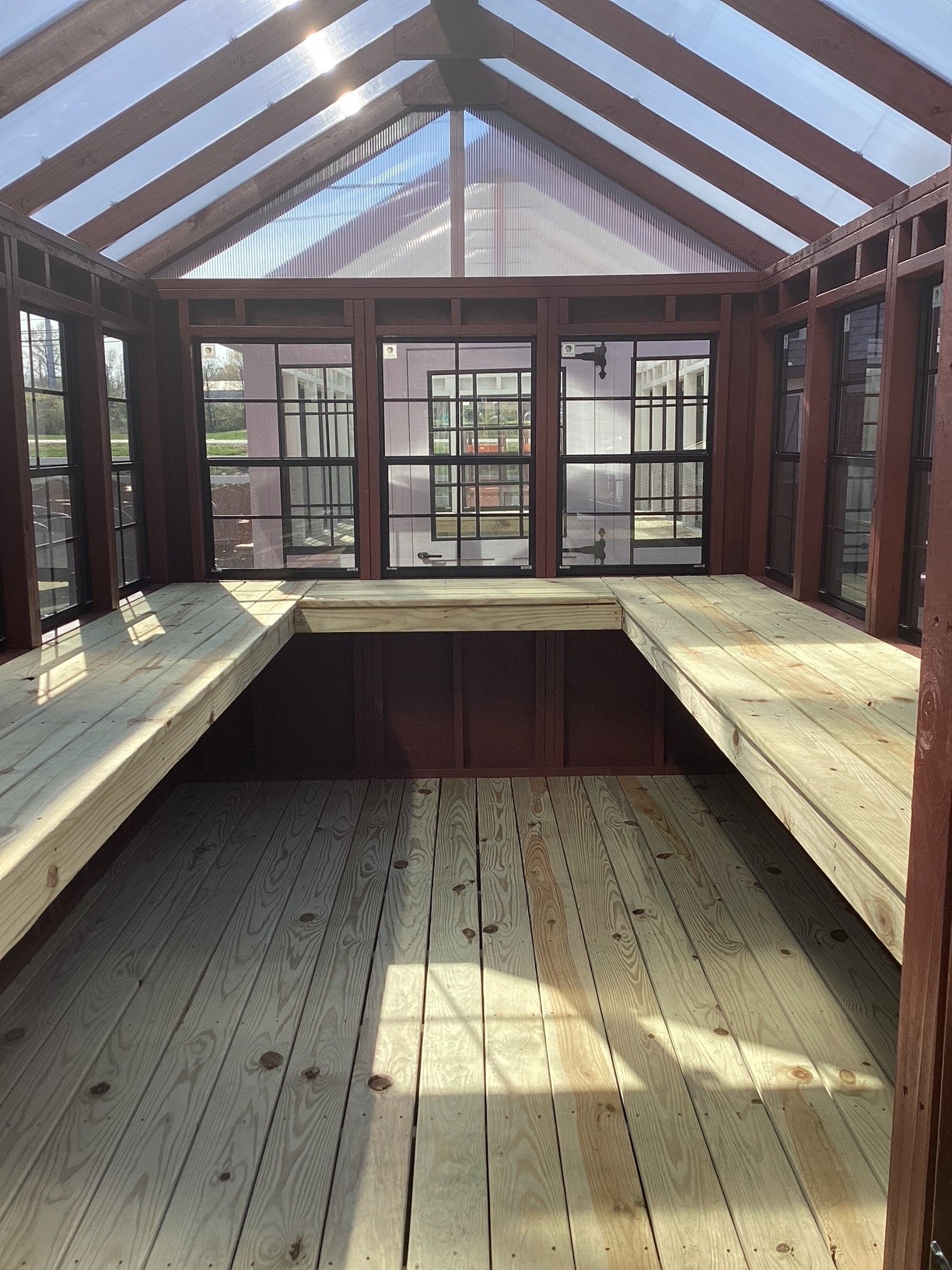 Built for both function and style, this custom structure features durable T1-11 siding finished in a rich Barn Red, with matching trim for a clean, cohesive look. The clear polycarbonate roof allows abundant natural light to fill the interior, creating a bright and inviting workspace throughout the day.