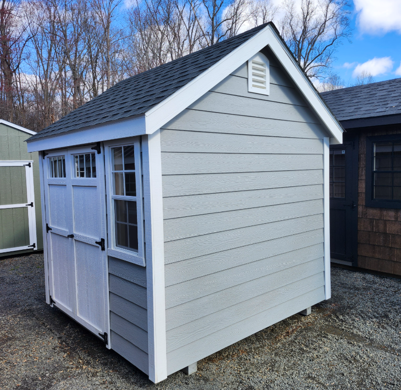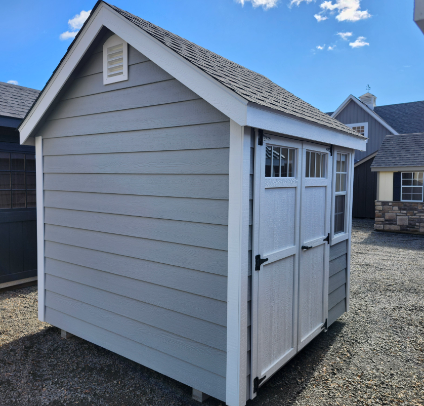 harming and functional, this 8×8 A-Frame features durable lap siding in a versatile gray, accented by crisp white trim for a clean, classic look. The charcoal shingle roof provides long-lasting protection while complementing the structure’s timeless design.